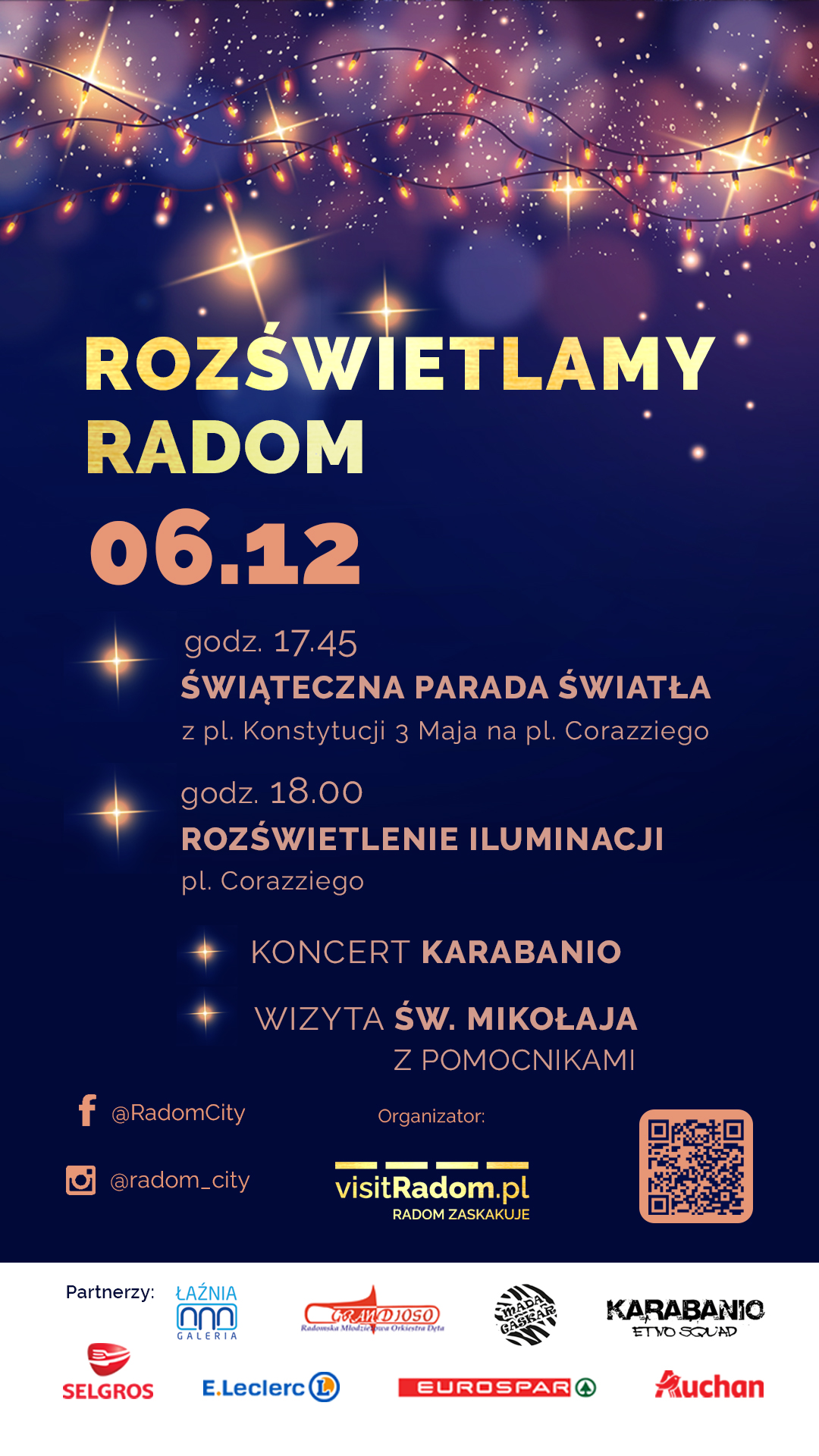 Wydarzenie rozpocznie przemarsz „Świątecznej Parady Światła” w wykonaniu jednej z najlepszych młodzieżowych orkiestr w Polsce – Radomskiej Młodzieżowej Orkiestry Dętej Grandioso i Orkiestry Małe Grandioso z Placu Konstytucji 3 Maja na plac Corazziego, gdzie na najmłodszych uczestników i nie tylko czekać będzie moc atrakcji: konkursy z nagrodami, okolicznościowo przystrojony pomnik Jana Kochanowskiego i przede wszystkim spotkanie ze św. Mikołajem i jego pomocnikami. Po uroczystym uruchomieniu iluminacji odbędzie się wspólne koncertowanie z zespołem Karabanio, który z tej okazji przygotował wyjątkowy utwór „Rozświetlamy Radom”.